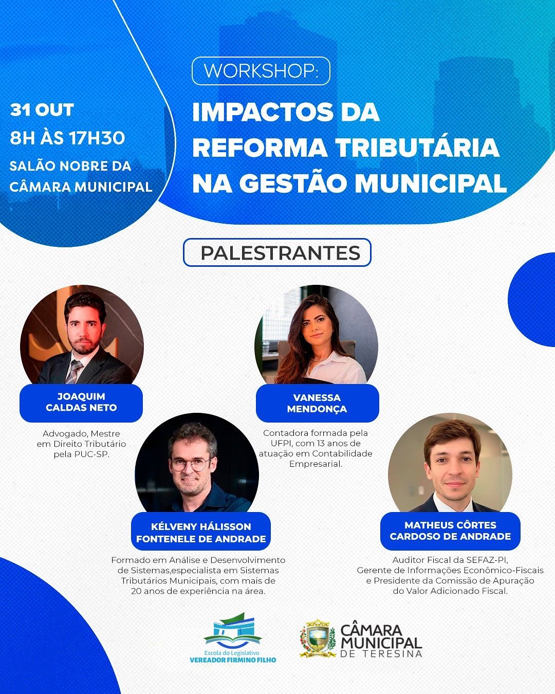 A Câmara Municipal de Teresina, por meio da Escola do Legislativo, realizará no dia 31 de outubro o Workshop “Impactos da Reforma Tributária na Gestão Municipal”, voltado para servidores, gestores públicos e profissionais que atuam nas áreas de finanças, contabilidade e arrecadação. As inscrições são gratuitas e podem ser feitas por meio de formulário disponibilizado pela Escola do Legislativo.