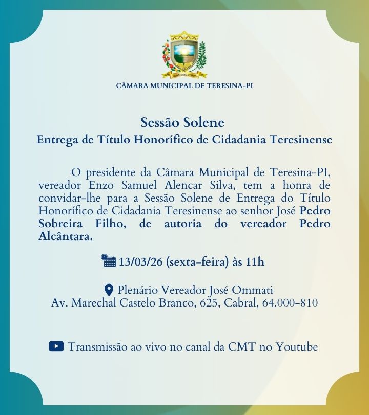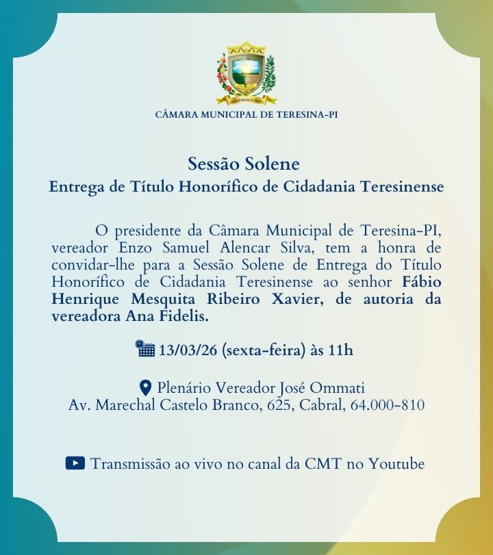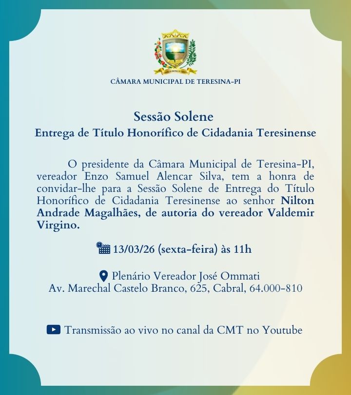 3ª Sessão Solene para entregas coletivas de Título Honorífico de Cidadania Teresinense (2026)